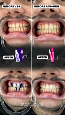 This template wins on transformation as the primary proof mechanism: a side-by-side before/after lets viewers verify whitening with their own eyes, reducing perceived risk—critical in MOF consideration. It targets solution-aware users by naming specific methods (“V34” and “PAP+ pen”), matching how shoppers compare ingredients and formats. The clinical close-up and cheek retractors signal authenticity and seriousness, while the compact product shots connect the outcome to a concrete SKU. Minimal copy avoids distraction and keeps attention on the visual evidence; the small disclaimer area supports trust and compliance best practices in beauty/health advertising. Overall, it aligns with performance creative principles: fast comprehension, clear claim framing, and immediate product attribution.
