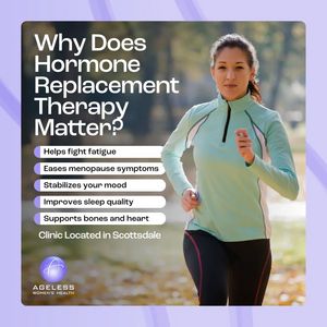 This square health & wellness ad template is designed for a women’s health or medical clinic promoting hormone replacement therapy (HRT). The layout pairs a confident outdoor running lifestyle photo o...