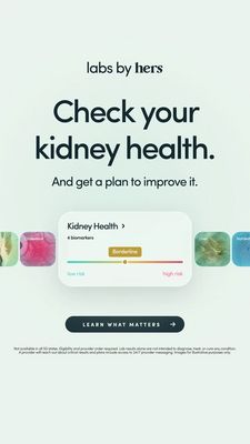 This 9:16 Story template promotes an at‑home kidney health lab test and results dashboard. The design is clean and clinical: a pale mint background, bold black sans‑serif headline, and a centered UI-style results card showing “Kidney Health,” biomarker count, and a risk spectrum from low to high with a “Borderline” marker. Soft, colorful rounded tiles at the sides hint at other health panels (e.g., cholesterol, liver, nutrients), reinforcing a broader testing ecosystem. The strategy is top‑of‑funnel awareness for an otherwise unaware audience: it leads with a simple, preventive promise (“Check your kidney health”) and immediately adds a next step (“get a plan to improve it”), activating curiosity, control, and risk reduction without medical jargon. A dark, high-contrast pill CTA (“Learn what matters”) anchors the layout and guides taps. Customize by swapping the organ focus, adjusting the biomarker labels and scale colors, and replacing the brand lockup with your clinic, telehealth, or lab-testing service identity while keeping the dashboard visual as the credibility cue.