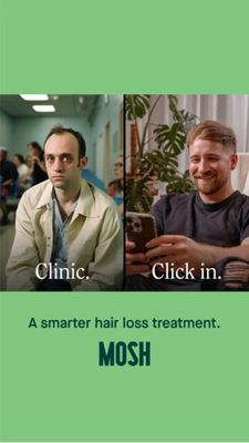This template wins by turning an abstract promise (“easier hair loss care”) into a concrete comparison the brain can process instantly. The clinic-side image signals hassle, discomfort, and time cost, while the at-home phone scene delivers relief and control—activating the convenience trigger and lowering psychological friction. In top-of-funnel awareness for an “unaware” audience, the simple two-word headline structure (“Clinic.” / “Click in.”) educates without over-explaining and invites curiosity. The calm green framing supports a health/medical association and keeps attention centered on the contrast, a best practice for Story placements where viewing time is short. The result is a clear first step message that primes users to start an online intake without feeling pressured.