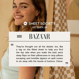 This square ad template is designed for premium bedding brands selling sheets, pillowcases, and duvet covers, using a high-trust “as seen in” press quote to win attention fast. A warm, cozy lifestyle photo fills the background: a smiling person in soft light with a beige-and-white check pattern that instantly signals home comfort. Centered on top, a clean white editorial card mimics a magazine clipping, featuring a bold “BAZAAR” masthead and a long quotation block with oversized quotation marks—perfect for showcasing a real review about thoughtful product details (deep pockets, zipper duvet, stay-put pillowcases). The typography contrasts a modern sans headline with classic editorial styling, creating a premium, reputable feel. Psychologically, it leverages trust and aspiration at top-of-funnel for unaware audiences: instead of pushing specs, it borrows credibility from a recognizable publication format. Customize by swapping the masthead with your press logo, tightening the quote to 2–3 strongest benefits, and adding your brand mark and CTA while keeping the editorial card structure intact for maximum authority.