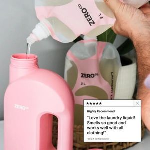 This square ad template is built for a refillable laundry detergent brand and spotlights the “refill” moment to make sustainability feel effortless. The main visual is a close-up product scene: a soft pink detergent bottle in the foreground while a hand pours clear liquid from a matching pink refill pouch labeled “ZERO co.” The background stays neutral and slightly blurred, keeping attention on the pour and packaging system. A white review pop-up with star rating and a bold “Highly Recommend” header anchors the lower-right corner, turning a simple product shot into a consideration-stage creative. The testimonial copy reduces risk (works with all clothing) while the sensory benefit (“smells so good”) adds emotional payoff. Clean sans-serif typography and high contrast between the white review card and pastel product colors improves readability in-feed. This approach works for solution-aware shoppers comparing detergents: it demonstrates convenience (refill into bottle), signals cleanliness, and adds satisfaction through social proof. Customize by swapping the quote, adjusting the accent color to your brand palette, and replacing the pouch/bottle labels while keeping the pour action as the hero proof point.