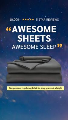 This 9:16 Story template promotes premium bed sheets focused on sleep comfort and cooling performance. The design uses a deep midnight-blue, starry background that instantly signals “night” and restful sleep, while a crisp, all-caps white headline creates strong thumb-stopping contrast. At the top, “10,000+” and five gold stars act as immediate social proof, reducing perceived risk for first-time buyers. Center stage is a clean product close-up of neatly folded dark gray sheets, keeping the message product-first and easy to scan. A soft yellow information strip near the bottom highlights the key benefit: temperature-regulating fabric that keeps you cool all night—perfect for hot sleepers. Strategically, this creative sits at top-of-funnel awareness for an “unaware” audience: it leads with a simple promise (“Awesome sheets, awesome sleep”) and credibility cues before asking for purchase. Brands can customize by swapping the sheet color, adding a logo lockup, and replacing the benefit bar with features like hypoallergenic weave, deep pockets, or bamboo/cotton blends—without losing the clean hierarchy.