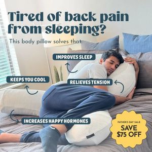 This square ad template promotes a supportive body pillow designed to reduce back pain and improve sleep comfort. The creative uses a full-bleed lifestyle bedroom photo: a person sleeping on their sid...