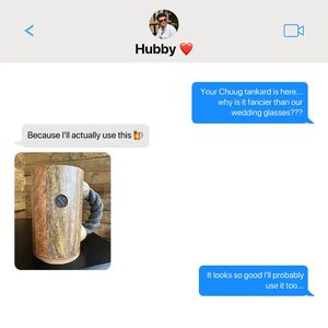The template wins attention by borrowing a familiar iMessage interface—viewers instantly understand the context without reading a headline block. Humor acts as the primary trigger, turning a product feature (a premium-looking tankard) into a punchline that feels authentic and shareable. Because the audience is “unaware,” the conversation format introduces the item naturally, like a real delivery moment, which lowers resistance and increases curiosity. In top-of-funnel awareness, the goal is stopping the scroll and creating memorability; the blue/gray bubble contrast guides the eye through a quick setup and payoff while the rustic photo anchors credibility and perceived craftsmanship. Gift appeal is baked in: it frames the product as something a partner would genuinely use, making it easy for shoppers to justify buying now and then clicking through to see personalization, price, and shipping.