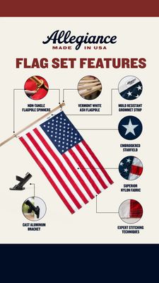 This creative works because it turns an emotional purchase (patriotic display) into a rational, low-risk choice through structured proof. The diagram-style callouts and macro details trigger quality craftsmanship and durability—viewers can “see” stitching, grommets, and materials instead of trusting vague claims. That’s ideal for a MOF consideration audience that is solution-aware and actively comparing sets. The bold headline establishes the frame (“features”), while the clean cream background and consistent navy/red palette keep readability high on mobile. By listing non-tangle spinners, mold resistance, and cast aluminum hardware, the template directly addresses common outdoor pain concerns (weathering, tangling, weak brackets) without needing aggressive discounting, supporting premium positioning and higher AOV.