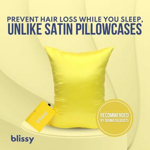 This square ad template promotes a silk pillowcase positioned as a nighttime solution for reducing hair breakage and shedding. The design is product-centered: a bright yellow pillowcase sits in the mi...