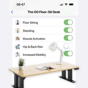 The template leverages curiosity and aspiration by presenting an unconventional product (a floor-sit desk) through a familiar “settings” interface. Green toggles act as instant visual proof—benefits look like they can be turned on with one decision—reducing perceived effort and increasing approachability. Showing “Hip & Back Pain” switched off cues comfort relief without requiring detailed technical explanations, which fits top-of-funnel awareness for an audience that may not yet be actively researching ergonomics. The clean white UI and minimal product styling build trust and modernity, while the staged desk photo anchors the claims in a real, desirable home-office scene. Best-practice-wise, it translates features into outcomes, uses icon-led scanning for mobile viewing, and keeps cognitive load low so viewers can understand the value proposition in seconds.
