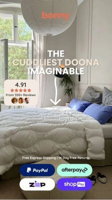 This 9:16 Story template promotes a premium “doona” (comforter/duvet) with an instantly relatable, cozy bedroom lifestyle scene. The full-bleed photo shows a neatly made bed with a lofty white quilted doona, soft daylight, and calm home styling—perfect for conveying comfort at a glance. A bold, centered all-caps headline (“THE CUDDLIEST DOONA IMAGINABLE”) delivers a single, memorable promise for cold, scroll-fast audiences. Social proof is built in through a prominent rating card (4.91 from 350+ reviews) with star icons and customer avatars, reducing perceived risk in TOF awareness where viewers may not be actively shopping yet. A downward arrow guides attention to the product-in-use, while the footer adds friction reducers: free express shipping, 14-day free returns, and recognizable payment options (PayPal, Afterpay, Zip, Shop Pay). Brands can customize by swapping the bedroom photo, updating the headline to a unique material/benefit claim (cooling, hypoallergenic, weighted), and replacing the review count and policy line with real store metrics to keep credibility high.