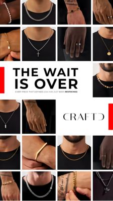 This template works because it pairs an unmistakable availability hook (“THE WAIT IS OVER”) with immediate visual proof. For solution-aware shoppers in the consideration stage, the main objection is often timing and stock—restock messaging removes friction and reactivates intent. The grid of tight product-and-wear shots communicates range (rings, chains, pendants, bracelets) in one glance, letting viewers self-identify with a style quickly—an aspiration and style-identity trigger. Clean white space and heavy black typography keep the message legible on mobile, while small red accents add urgency without resorting to discounting. The logo/wordmark zone supports brand recall, making this a strong retargeting and drop-announcement creative for premium men’s jewelry.