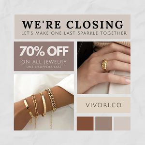 This square jewelry ad template is built for a decisive, bottom-of-funnel push: a clear store-closing message paired with an aggressive “70% OFF” offer and “until supplies last” scarcity. The design u...