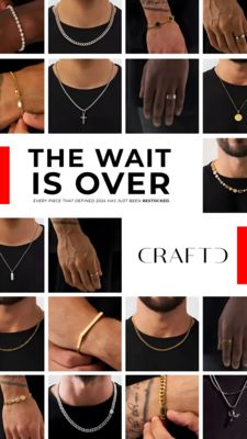 This template works because it turns a simple inventory update into a desire signal. “The wait is over” frames the collection as previously unavailable, activating scarcity and FOMO—especially effective in men’s jewelry where best sellers reduce perceived style risk. The surrounding grid provides breadth (chains, rings, bracelets) so solution-aware viewers can quickly self-select a style without extra clicks, matching mid‑funnel consideration behavior. High-contrast black lifestyle crops against a white message block create instant hierarchy: the headline grabs attention, then the eye scans the wearable close-ups for texture and fit. Red accent bars add urgency cues without resorting to discount language, keeping the positioning premium. The small supporting line (“defined 2024”) adds implied social proof and trend authority, reinforcing that the restocked pieces are already validated by demand.