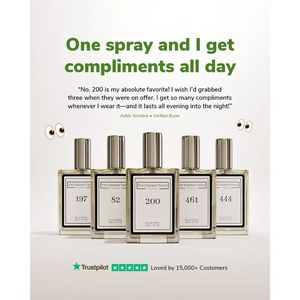 This creative works because it pairs aspiration (“I get compliments all day”) with hard reassurance (verified review, Trustpilot stars, and a large customer count). In perfumes, shoppers can’t sample scent digitally, so perceived risk is high; social proof is the fastest substitute for sensory experience. The layout is optimized for MOF consideration and product-aware audiences: it assumes interest already exists and focuses on performance claims (compliments, all-day wear) backed by a named buyer and third‑party rating. The clean, minimalist bottle lineup signals professionalism and range, while the hero bottle forward placement guides choice toward the featured SKU. Overall, it follows best practices: one primary benefit, one credibility block, and one unmistakable product presentation—ideal for converting comparisons into add‑to‑cart actions.