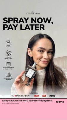 This template converts at the BOF/decision stage by reducing financial and perceived-risk barriers. The “Spray now, pay later” promise tackles price hesitation with convenience (BNPL), while the icon stack compresses key objections into fast, credible proof points (longevity, ethical formulation, guarantee, savings). The lifestyle portrait with the bottle provides a human cue and clear product identification—important for product-aware users who need confirmation, not education. The “Featured in” strip adds authority-based social proof, borrowing trust from known publications. Best-practice hierarchy is strong: one dominant offer headline, one hero image, then scannable supporting claims and a high-contrast footer that reiterates the payment benefit—ideal for mobile Story placements where attention is limited.