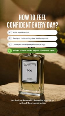 This creative works because it turns a perfume pitch into an interactive question, leveraging curiosity to earn attention at TOF awareness for an unaware audience. The multiple-choice structure creates a low-effort micro-commitment: viewers read options and mentally “answer,” making the final highlighted line feel like a satisfying reveal rather than a hard sell. The warm, luxury-toned lifestyle background borrows high-end visual codes, supporting the aspiration trigger, while the bold green highlight adds contrast and directs the eye to the value message and entry price. Featuring the bottle large and centered reinforces product legitimacy and improves recall. Best-practice-wise, it follows a clear visual hierarchy (headline → options → reveal → supporting tagline) optimized for fast Story consumption.