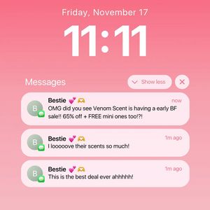 This creative wins by reframing a perfume discount as a trusted “hot tip” delivered via a familiar lock-screen notification. That UI mimic instantly signals authenticity and triggers curiosity—viewers read to find out what the deal is and who it’s from. The follow-up messages act as lightweight social proof, validating both the brand and the offer without needing testimonials or ratings. Scarcity is implied through the real-time timestamps and the Black Friday context, nudging quick action. Because the funnel stage is TOF and the audience is largely unaware, the template avoids heavy product education and instead uses pattern interruption to earn attention first, then communicates a simple, high-contrast value proposition (65% off + free minis). It follows best practices for mobile feeds: big hierarchy, minimal clutter, and a single clear takeaway that’s easy to swap for different campaigns.