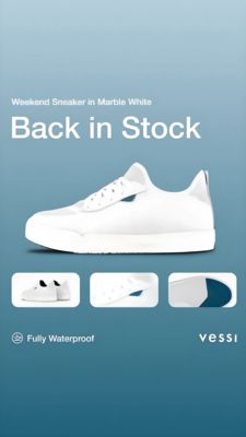 This template works because it targets a product-aware audience in the consideration stage: people already interested just need a clear signal that the item is available again. The oversized “Back in Stock” headline delivers instant clarity, reducing cognitive load and preventing scroll-by. The cool gradient and minimalist spacing create a premium, modern cue that fits sneaker culture and supports aspiration without looking “salesy.” Scarcity is leveraged indirectly—restock implies prior sell-out—while novelty is reinforced through the color name line. The three close-up tiles act as micro-evidence, a best-practice for MOF ads: they answer silent objections (quality, build, features) in seconds. The single benefit callout (“Fully Waterproof”) anchors differentiation, making the offer memorable and easier to justify at checkout.