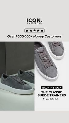 This template works by stacking two high-impact decision drivers for product-aware audiences in the consideration stage: credibility and urgency. The five-star visual and the “1,000,000+ Happy Customers” line function as fast social proof, reassuring shoppers that the sneakers are a proven choice and reducing perceived risk. Immediately after that trust cue, the “Back in Stock” badge introduces scarcity—implying prior sell-outs and prompting action before inventory runs out again. Visually, the split-screen combines lifestyle context (how the shoe looks in a real setting) with a clean close-up (material/finish validation), which is a best practice for footwear ads where texture and silhouette matter. The restrained monochrome palette keeps attention on the suede and makes the message easy to scan on mobile.