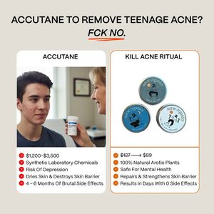 This template works by combining curiosity and safety triggers in a highly scannable comparison. The blunt headline pattern-interrupts and signals a strong point of view, earning attention from solution-aware users already considering acne options. The split layout functions like a decision matrix: the left column anchors perceived cost and risk (synthetic chemicals, depression risk, barrier damage), while the right column reframes the purchase as a safer, natural routine with fast results. That’s ideal for mid-funnel consideration because it addresses objections (side effects, irritation, mental-health concerns) before the click. The price strike-through adds a value cue without relying on heavy discount styling, and the checkmark/X iconography guides the eye through the argument in seconds—an ad best practice for mobile feeds where time-to-understand is critical.