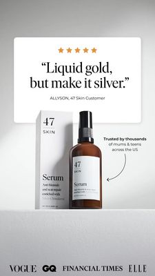 This creative works because it sells “proof” before it sells “features.” For a solution-aware audience already considering a serum, the five-star row and oversized customer quote act as immediate social proof, reducing perceived risk and shortening decision time. The named attribution adds specificity that feels real, while the minimalist, editorial layout signals premium quality—an important trust heuristic in skincare where safety and efficacy concerns are high. The “Trusted by thousands…” line extends the proof from one reviewer to a larger crowd, and the arrow provides a subtle visual cue that ties the credibility directly to the product shot. In a mid‑funnel context, this balance of authority + clean design helps justify pricing and encourages a direct “shop now” action without needing heavy educational copy.