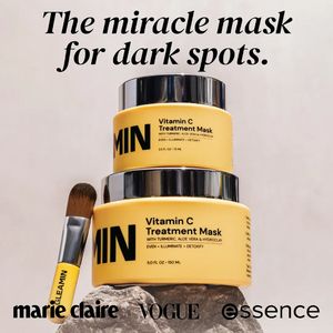 This square skincare ad template is built for a Vitamin C treatment mask positioned as a premium solution for dark spots and uneven tone. The design centers on a crisp product close-up: two stacked ye...