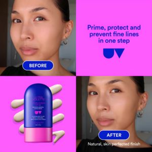 This template works because it matches a solution-aware, mid-funnel skincare audience: people already shopping for SPF want reassurance about finish and efficacy. The before/after grid provides immediate, low-effort proof (transformation trigger) while the packshot and cream swatches add product tangibility and credibility. The headline focuses on a “one step” routine upgrade—prime, protect, prevent—reducing perceived complexity and increasing perceived value. High-contrast cobalt text on a vibrant pink gradient improves thumb-stopping visibility and fast comprehension, a best practice for feed ads. Overall, the creative balances aspiration (smooth, natural skin) with evidence (before/after) and clarity (single core claim), making it ideal for comparison moments and retargeting sequences where users need a reason to choose your formula now.