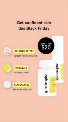 This creative converts because it matches a solution-aware, MOF audience: viewers already want acne relief, so the template quickly answers “what’s in it” and “why it works.” The three highlighted actives act as an instant credibility cue, reducing perceived risk through specificity and a clinical visual language (white packaging, minimal palette). The Black Friday headline and the prominent “Start for $20” badge introduce value-savings and urgency without clutter, creating a clear reason to act now. The scannable left-column structure follows mobile best practice: bold ingredient names, short benefits, then the product proof on the right. Overall, it balances education + promotion—ideal for consideration-stage retargeting where clarity and price anchoring can tip the decision.