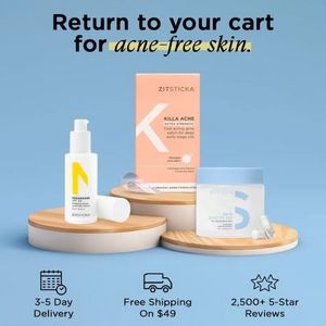 This creative works because it targets solution-aware users at the MOF consideration stage: they already believe an acne solution can help, but friction (price, delivery, uncertainty) stopped the purchase. The headline is a clear cart-recovery command paired with a concrete outcome (“acne-free skin”), reinforcing intent. Trust and convenience triggers do the heavy lifting: fast delivery reduces waiting anxiety, the free-shipping threshold nudges basket-building, and the “2,500+ 5-star reviews” provides social proof that lowers perceived risk. The centered bundle photo anchors attention and implies a complete routine, which fits shoppers looking for an easy, all-in-one fix. Clean studio styling and restrained color further signal credibility—an important best practice for skincare performance ads where users scrutinize legitimacy before buying.