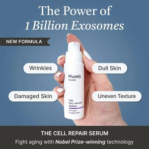 This template converts in the consideration stage by pairing a bold, quantified ingredient claim (“1 Billion Exosomes”) with instantly recognizable skin concerns. The big-number headline triggers curiosity and perceived potency, while the four pill callouts reduce cognitive load: viewers can self-identify (wrinkles, dullness, damage, uneven texture) in a split second. The centered in-hand product shot adds tangibility and trust—showing scale and making the bottle feel “real,” not overly retouched. A clean, medical-adjacent palette and serif headline signal premium science, supporting solution-aware shoppers who are comparing formulas and looking for credible differentiation. The bottom bar provides a structured space for proof points (clinical results, tech explanation, routine placement), aligning with best practices: one hero promise, scannable benefits, and a clear informational CTA that invites the next step without sounding salesy.