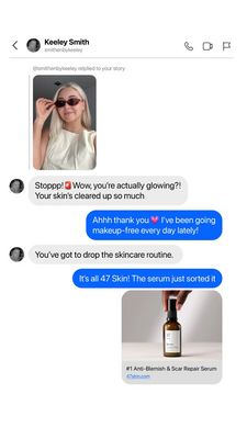 This 9:16 Story template is designed for an anti-blemish and scar-repair skincare serum, using a DM-style conversation to make the product discovery feel organic. The layout mimics an Instagram messag...