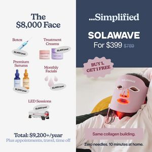 This square skincare ad template promotes an at‑home LED face mask by reframing anti‑aging as a cost problem. The layout is a clean split-screen: the left panel looks like an expense breakdown titled “The $8,000 Face,” pairing small product icons (Botox syringe, creams, serums, facials, LED sessions) with yearly price callouts and a bold total at the bottom. The right panel shifts to the solution with a lifestyle image of a person relaxing while wearing a glowing LED mask, a prominent product name, and a discounted price with a strikethrough anchor. A scalloped “BUY 1 GET 1 FREE” badge adds urgency without clutter. The palette mixes navy, off‑white and soft blush, balancing clinical credibility with beauty warmth. This creative fits mid‑funnel, solution‑aware audiences: it educates, reduces perceived risk through comparison, and uses price-savings plus convenience (“10 minutes at home”) to overcome hesitation. Swap the cost items, currency, offer badge, and bottom benefit bar to match any device brand or campaign.