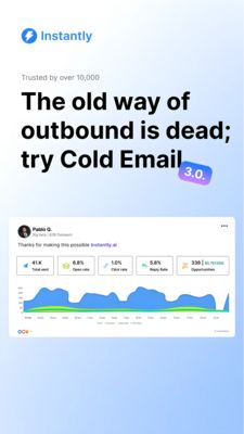 This Story-format template promotes a B2B cold email outreach/analytics platform with a strong social-proof hook. The design is clean and SaaS-native: a light sky-to-periwinkle gradient background, oversized bold black headline typography, and a small “3.0” rounded badge that adds a product-update cue. The brand mark sits top-left for instant recognition, while the lower half features a realistic social post-style screenshot with performance tiles (sends, open rate, click rate, reply rate) and a blue area chart—visually anchoring the promise in measurable results. Strategically, it targets solution-aware buyers in mid-funnel consideration: the copy challenges “the old way” of outbound and positions the tool as the modern alternative, leveraging authority (“Trusted by over 10,000”) and efficiency (metrics at a glance). This works for sales leaders and growth teams because it reduces perceived risk and makes ROI feel concrete. Customize by swapping the headline to your ICP pain point, replacing the dashboard stats with your real numbers, and adapting the accent badge to highlight a new feature, deliverability upgrade, or pricing tier.