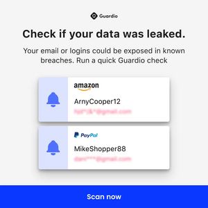 This template works by translating an abstract cybersecurity risk into a concrete, familiar scenario: notification-style cards that look like real account alerts. That specificity triggers risk avoidance without needing technical jargon, which is crucial for an unaware audience at top-of-funnel. The bold headline frames a single diagnostic question (“was leaked”), creating immediate relevance, while the subhead explains the consequence (exposed email/logins) and offers a simple next step. The large blue CTA bar reduces decision fatigue by presenting one obvious action. Clean typography and ample whitespace signal legitimacy—an essential best practice in security advertising where trust and clarity directly impact clicks and conversions.