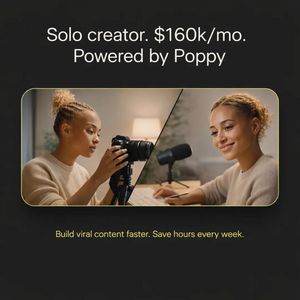 This template works because it combines aspiration and curiosity through a specific, concrete outcome (“$160k/mo”)—a high-salience metric that instantly signals success and invites the viewer to ask “how?”. The “Powered by” line creates implied causality without over-claiming, a best practice for credibility in TOF awareness. For solution-aware audiences who already believe tools can improve output, the bottom promise reframes the benefit into everyday relief: building viral content faster and saving hours weekly. The split-screen lifestyle image acts as visual proof of a real creator workflow (recording + planning), aligning the product with the viewer’s identity and tasks. Minimal copy, strong hierarchy, and a premium dark palette reduce cognitive load, making the message legible on mobile feeds while positioning the SaaS as a high-value creator advantage.