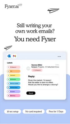 This 9:16 Story template promotes an AI email assistant built for busy professionals who are tired of drafting routine work replies. The design is minimalist and high-clarity: a clean white canvas, elegant serif headline centered (“Still writing your own work emails? You need Fyxer”), and playful paper-plane doodles that instantly signal “email.” The lower half anchors the message with a realistic Gmail-style UI mockup featuring color-coded labels and an AI-written reply preview, making the benefit tangible. Three pill-shaped proof points at the bottom (“30 sec setup,” “No card required,” “Free for 7 Days”) remove friction and support consideration-stage clicks. Strategically, the creative uses convenience and time-saving triggers, plus a light curiosity hook in the question headline. It’s ideal for solution-aware audiences comparing tools: the interface screenshot acts as a product demo, while the micro-offers reduce perceived risk. Customize by swapping the UI mockup to your product, adjusting the label colors to match brand palette, and replacing the three benefit pills with your strongest onboarding, security, or integration claims.