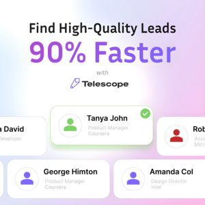 This square SaaS ad template promotes a B2B lead generation/prospecting tool that promises speed and efficiency. The design is clean and modern: a soft pastel gradient background (lavender to pink) supports a bold, oversized performance claim (“90% Faster”) in purple, with a smaller supporting headline above and a compact brand lockup (“Telescope”) beneath. The bottom half uses floating CRM-style contact cards with avatar icons, names, job titles, and company lines; one highlighted card includes a green checkmark, signaling verified or qualified leads. The creative strategy is top-of-funnel awareness for audiences who aren’t actively shopping yet: it hooks attention with a concrete metric (curiosity + efficiency trigger) and immediately visualizes the outcome through recognizable UI elements (social proof/credibility via “real” contacts). The minimal layout keeps scanning effortless in busy feeds. Customize by swapping the percentage claim, inserting your own app name/logo, and replacing the cards with your ICP roles (e.g., “VP Sales, FinTech”) to align with specific verticals and targeting.