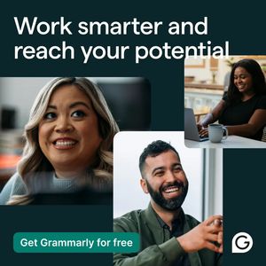 This square SaaS ad template is built to promote a writing assistant or workplace productivity app, using a confidence-and-efficiency message that fits top-of-funnel awareness. A large, bold white headline (“Work smarter and reach your potential”) sits on a deep teal background, instantly communicating the benefit without requiring prior brand knowledge. The layout uses a three-photo collage with rounded corners: one large close-up portrait on the left and two smaller professional lifestyle shots on the right, creating human connection and social proof by implication (real people, real work moments). A teal CTA pill at the bottom (“Get Grammarly for free”) provides a low-friction entry point, while a simple circular logo mark in the lower-right anchors brand recall. The restrained palette, clean sans-serif typography, and generous spacing make the message readable in fast-scrolling feeds. Swap the headline to your key promise, replace the photos with your target personas (teams, freelancers, students), and adjust the CTA wording for trials, demos, or extensions.