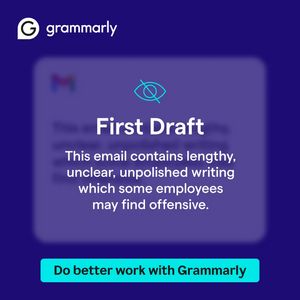 This template works by reframing a common habit—sending a “first draft”—as a professional risk. The blunt warning copy triggers problem–solution thinking and a mild fear of miscommunication (clarity, tone, and potential offense), which is highly motivating for workplace writers. Because the audience is solution-aware, the UI-like email card and clean hierarchy act as credibility cues, signaling that the tool integrates into daily workflows. In a mid-funnel consideration context, the design doesn’t over-explain features; it spotlights the consequence and invites a low-friction next step via a prominent CTA. The high-contrast teal button and large headline optimize thumb-stopping readability in feeds while keeping a business-appropriate, authoritative feel—ideal for decision influencers evaluating productivity software.
