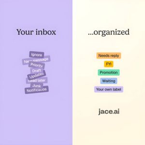 This square SaaS ad template promotes an email organization/inbox management tool by visualizing a clear “before vs after” transformation. The layout is a clean vertical split: a lavender left panel labeled “Your inbox” shows a messy stack of overlapping tags (Ignore, New message, Priority, Draft, Updates, Read later, Junk), while the warm cream right panel reads “…organized” and displays neat, color-coded labels (Needs reply, FYI, Promotion, Waiting, Your own label). The contrast instantly communicates convenience and control without needing product screenshots. Typography is elegant and high-contrast, giving the message a confident, premium feel, while the playful label chips add approachability. This creative is ideal for top-of-funnel awareness and an “unaware” audience: it triggers curiosity (“how do I get that organized?”) and promises transformation from clutter to clarity. Brands can customize by swapping label names to match their features, changing chip colors to brand palette, and replacing the bottom wordmark (“jace.ai”) with their own logo and URL.