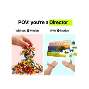 This template wins by turning an abstract SaaS benefit—simpler creative workflows—into a concrete visual metaphor. The “Without Motion / With Motion” split activates the transformation trigger: viewers instantly compare chaos (a pile of loose puzzle pieces) with completion (a coherent image), reducing cognitive load for an unaware audience. The POV framing (“you’re a Director”) adds identity-based motivation, making the user picture themselves in a higher-status role, which increases curiosity at top-of-funnel. Clean whitespace and short labels follow best practices for scroll environments: one bold hook, one comparison, one takeaway. The neon highlight creates a single focal point that guides attention to the promise, while the imagery implies that the product brings order, control, and a finished look—key drivers for trials and product page clicks.