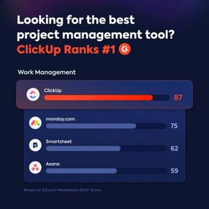 This template performs in mid‑funnel consideration because it mirrors how B2B buyers actually decide: they compare options and look for a trusted shortcut. The opening question qualifies intent (people already shopping for a PM tool), while the “Ranks #1” statement leverages authority and reduces perceived risk. The comparison bars and visible scores act as rapid, scan-friendly proof—essential in feed environments where attention is limited. Referencing an external scoring system (G2-style momentum score) adds social proof without needing long copy, and the highlighted top row creates a clear visual conclusion. Best-practice wise, it combines a strong hook, a single primary takeaway, and a structured data visualization that supports the claim, making it persuasive for stakeholders who must justify a software choice internally.