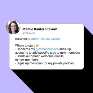 This square SaaS ad template is built as a tweet-style testimonial card that instantly communicates real-world results from workflow automation. A lavender background with a bold diagonal black shadow creates depth, while the rounded white message panel mirrors familiar social UI to boost believability. The left-aligned avatar circle and name/handle header establish “a real person said this,” then the body copy uses short bullet points to list concrete automations (tagging new members, sending welcome emails, podcast access). Typography is clean and readable, prioritizing skimmability on mobile. Strategically, it’s mid-funnel consideration creative: it leans on trust and credibility rather than hype, showing practical outcomes and time-saving convenience for solution-aware buyers evaluating tools like Zapier-style integrations. It works because prospects can map the bullets to their own processes in seconds. Customize by swapping the screenshot text with your customers’ exact wins, replacing @mentions with your app and integrations, and adding a subtle logo/CTA line at the bottom without breaking the native-social feel.