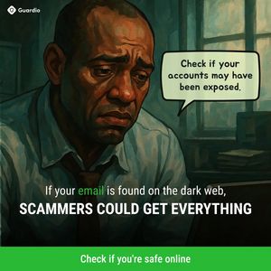 This square cybersecurity ad template is built to promote an account-breach check or identity monitoring tool. The design uses a moody, painterly illustration of a worried man in a dim room, immediately signaling anxiety and vulnerability—perfect for problem-aware audiences who suspect their data may already be at risk. A speech-bubble headline (“Check if your accounts may have been exposed.”) reads like a direct warning, while the oversized, all-caps statement (“SCAMMERS COULD GET EVERYTHING”) amplifies fear and risk aversion to drive action at the top of funnel. Typography is bold and high-contrast: white and green accents over a dark teal/blue background for strong readability in feeds. A bright green footer bar functions as a clear CTA area (“Check if you’re safe online”), anchoring the layout and guiding the eye from emotion to solution. Brands can customize by swapping the illustration style, adjusting the green accent to match brand color, and replacing the warning line with a stat (e.g., breach counts) while keeping the same urgency-first hierarchy for maximum scroll-stopping impact.