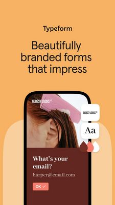 This 9:16 Story template promotes a form builder or lead-capture tool (Typeform-style) with a design-first promise: “Beautifully branded forms that impress.” The layout is minimalist and editorial—warm peach background, centered black headline, and a large phone mockup anchoring the lower half. Inside the screen, a lifestyle hair/beauty photo adds visual interest while the dark maroon form panel (“What’s your email?”) clearly demonstrates the product in use. Small UI tiles (logo, “Aa” typography, color swatches) reinforce customization and branding control without clutter. Strategically, it’s built for top-of-funnel awareness aimed at users who don’t yet feel the pain of poor conversion. The aesthetic-design trigger and curiosity (“how would my brand look?”) pull attention, while the email field preview makes the value tangible in one glance. Customize by swapping the phone image to match your niche (events, SaaS, e-commerce), replacing the sample brand name, and adjusting the accent button color to your palette while keeping the high-contrast headline for fast Story consumption.
