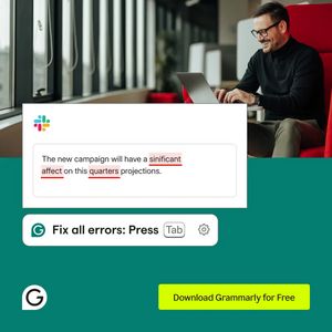 This square ad template promotes a writing assistant/grammar checker for professionals who need clean, confident business writing. The design uses a lifestyle photo of a person working on a laptop in ...