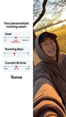 This creative sells personalization with immediate visual evidence. The slider-style UI blocks translate an abstract promise (“personalized coach”) into concrete inputs—goal distance, training frequency, and current 5K time—so viewers quickly understand how the app adapts to them. The golden-hour selfie adds aspiration and emotional warmth, signaling that training fits real life, not just elite athletes. It’s well suited to top-of-funnel and an unaware audience: the headline is plain, benefit-first, and avoids jargon, while the interface preview reduces uncertainty and perceived effort. The split-screen format follows best practices by pairing product proof (UI) with lifestyle context (runner), increasing trust and making the next step feel simple—perfect for a “Get started” CTA and app-install objective.