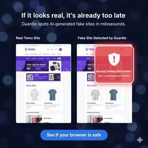 This square cybersecurity ad template promotes a browser protection app (Guardio) focused on detecting AI-generated scam websites and stopping phishing attempts before users enter sensitive data. The design uses a dark navy bokeh background to signal “online risk,” paired with crisp white headline typography for immediate readability. The center is a split-screen comparison: a “Real Site” browser screenshot on the left and a “Fake Site Detected” version on the right, topped with a high-contrast red alert card featuring a shield icon and warning text. This visual proof makes the threat feel concrete and current, tapping fear and safety/security triggers while keeping the promise simple: fast detection in milliseconds. Built for top-of-funnel awareness among unaware users, the template educates through a quick side-by-side demonstration rather than technical jargon. The rounded blue CTA button at the bottom (“See if your browser is safe”) lowers friction and invites a risk-check action. Brands can customize by swapping the example site, adjusting the warning copy, and aligning the alert and CTA colors with their UI.