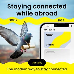 This square ad template is built for an eSIM or mobile connectivity app that helps travelers stay online abroad without expensive roaming. The concept hinges on a clever time-contrast: a pigeon with a scroll (labeled “1800s”) versus a modern smartphone eSIM screen (labeled “2024”), instantly communicating progress from slow messaging to instant data. The layout uses a sky-blue background for clarity and trust, while bright yellow wavy bands create a bold highlight zone for dates and supporting copy. A large, heavy sans-serif headline at the top (“Staying connected while abroad”) delivers the core promise fast, and the rounded black CTA button (“Get Saily”) anchors attention in the center. This design works best in top-of-funnel awareness for unaware audiences: the visual metaphor sparks curiosity, then the simple tagline (“The modern way to stay connected”) frames the solution. Brands can customize by swapping the app UI, changing the CTA text, and adjusting the yellow accent to match brand colors while keeping the strong contrast.