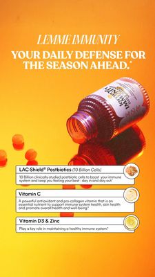 This 9:16 Story template is built for an immunity gummy supplement and uses an ingredient-led “daily defense” message that fits product-aware audiences in the consideration phase. The design opens with a premium, high-contrast headline in a serif typeface (“YOUR DAILY DEFENSE FOR THE SEASON AHEAD”) over a warm orange-to-golden gradient that signals energy and seasonal readiness. A tipped supplement bottle and scattered gummies create a strong product cue and immediate category recognition. The lower half shifts into a clean, structured education block: three stacked white cards with bold ingredient headers (LAC‑Shield® Postbiotics, Vitamin C, Vitamin D3 & Zinc), short benefit explanations, and circular ingredient thumbnails. This format leverages trust signals (clinically studied claim, quantified “10 billion cells”) and prevention framing, helping buyers compare formulas quickly. Brands can customize by swapping the bottle shot, adjusting the ingredient rows to match their formula, and replacing the quantified claim with compliant, evidence-backed numbers while keeping the same crisp hierarchy for fast mobile scanning.
