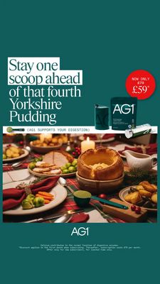 This 9:16 Story template promotes a daily greens powder supplement with a witty, seasonal hook. The design uses a deep teal solid background and oversized, editorial serif typography stacked in white blocks for instant readability. A festive food lifestyle photo fills the lower half—holiday tableware, a Yorkshire pudding centerpiece, and warm candlelight—creating a relatable “treat season” context. The product pack, shaker, and scoop sit cleanly above the photo, while a high-contrast red price badge (“Now only £59”) adds a clear conversion cue. A slim benefit strip (“AG1 supports your digestion”) anchors the functional promise without overexplaining, making it ideal for top-of-funnel awareness and curiosity. This creative works because it reframes supplementation as a routine that helps you stay on track during indulgent moments, tapping aspiration and routine-building rather than fear. Brands can customize by swapping the meal scene to match their cultural moments, adjusting the price badge, and replacing the benefit strip with their strongest single claim (energy, immunity, gut support) while keeping the premium editorial look.